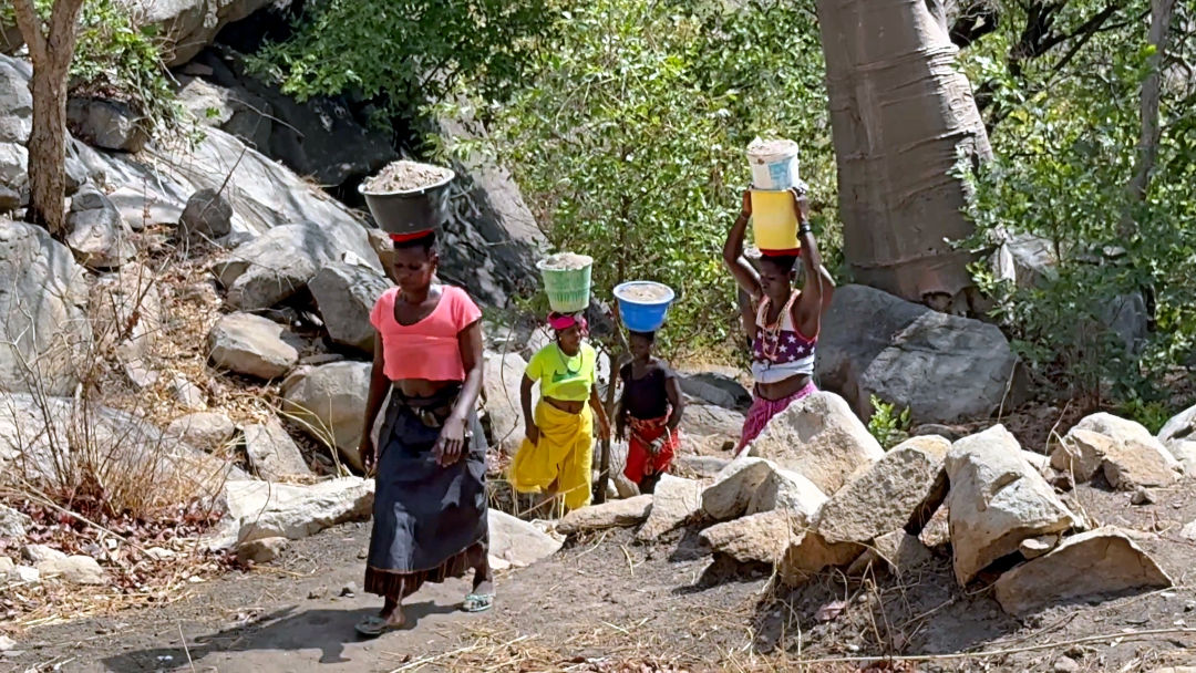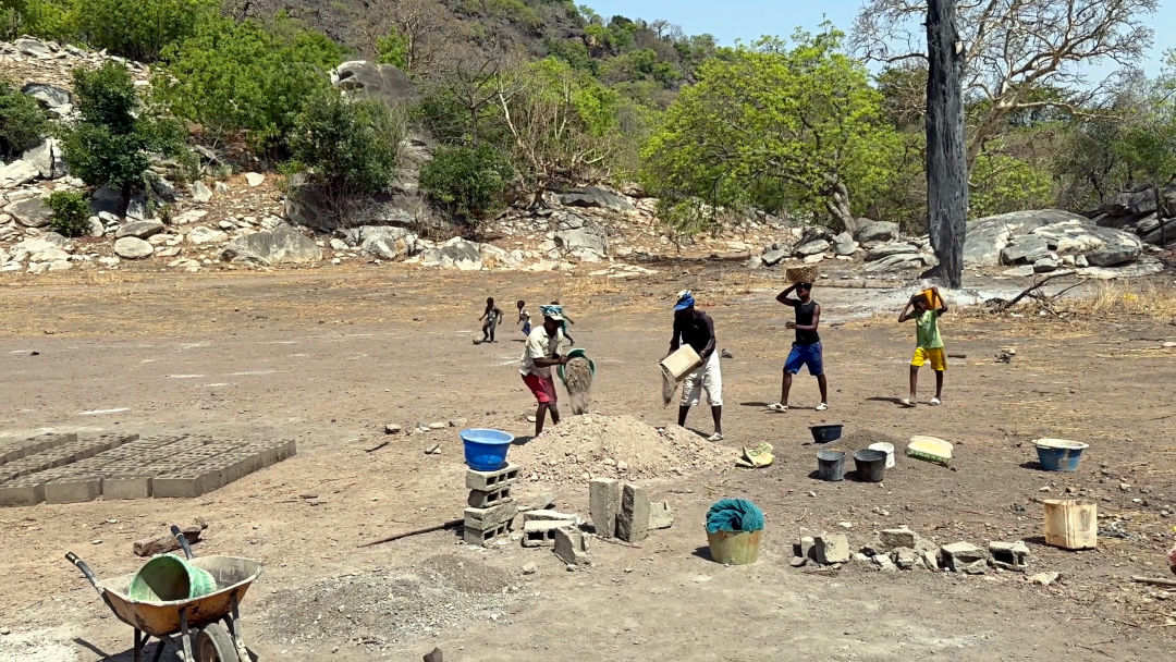 Les enfants, les jeunes, les femmes, les hommes montent les parpaings, le ciment et toute la marchandise utile à la fabrication de l'école !